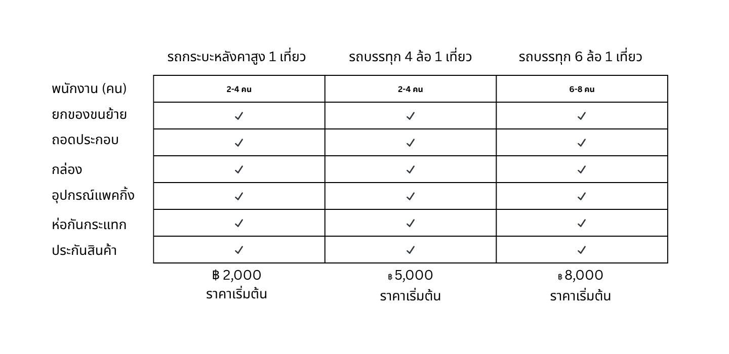 เรามอบบริการคุณภาพสูงในราคายุติธรรม โดยมีแพ็กเกจหลากหลายเพื่อตอบโจทย์ทั้งความต้องการและงบประมาณ ไม่ว่าจะขนย้ายเพียงไม่กี่ชิ้น หรือย้ายทั้งบ้าน เรามีตัวเลือกยานพาหนะที่หลากหลาย เช่น รถกระบะ 4 ล้อ รถบรรทุก 6 ล้อ รวมถึงรถบรรทุกขนาดเล็กและใหญ่